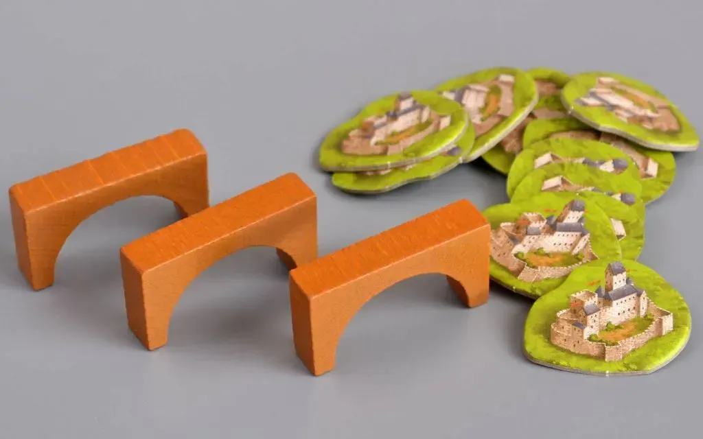 Доповнення включає 12 нових тайлів (деякі з базарами, деякі з основами для замків), 12 дерев’яних мостів (по 3 на кожен колір у грі на 4 гравці; якщо граєш з іншими доповненнями на 5-6 гравців, можливо, доведеться докуповувати мости окремо) і 12 тайлів замків. Усі компоненти якісні, дерев’яні, приємні на дотик.