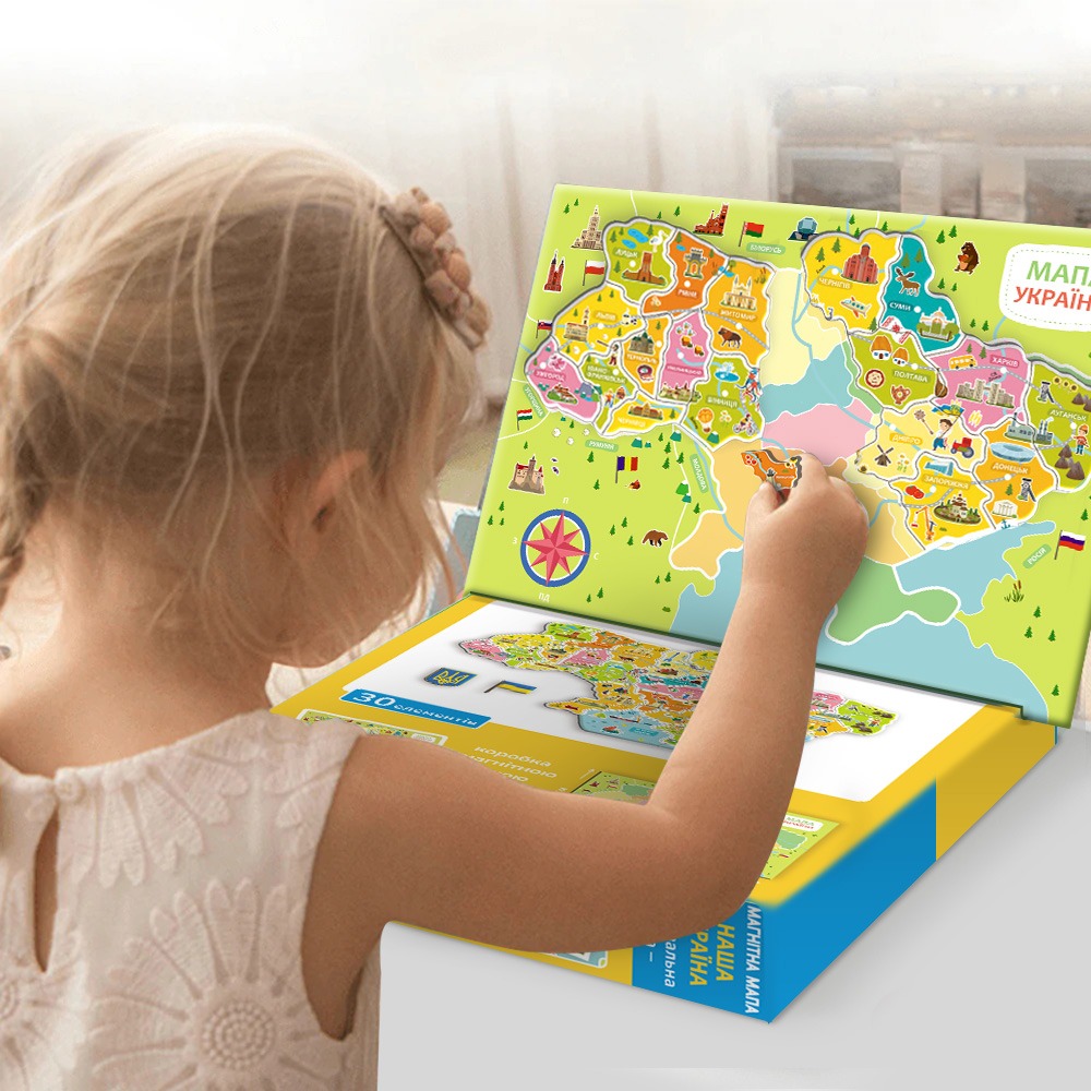У наборі знайдеш магнітну дошку з контурами України та 30 яскравих магнітних елементів, кожен з яких зображає окрему область із її найвідомішими визначними пам’ятками, символами та цікавинками. Карпати, Софійський собор, Хортиця, козацькі традиції, унікальна архітектура – усе це чекає на маленького дослідника!