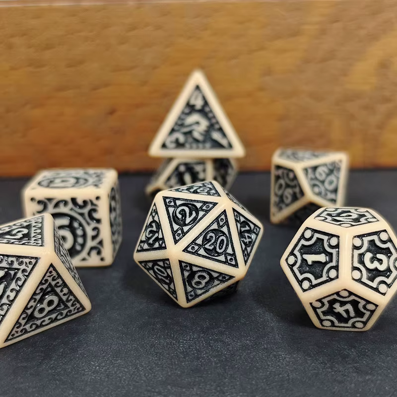 Семикубиковий набір у благородному стилі: основа кольору слонової кістки, чорні цифри та візерунки. D4, D6, D8, D10, D12, D20, відсотковий D100. Непрозорі, стилізовані — кубики, які виглядають, ніби їх знайшли в стародавній скарбниці.
