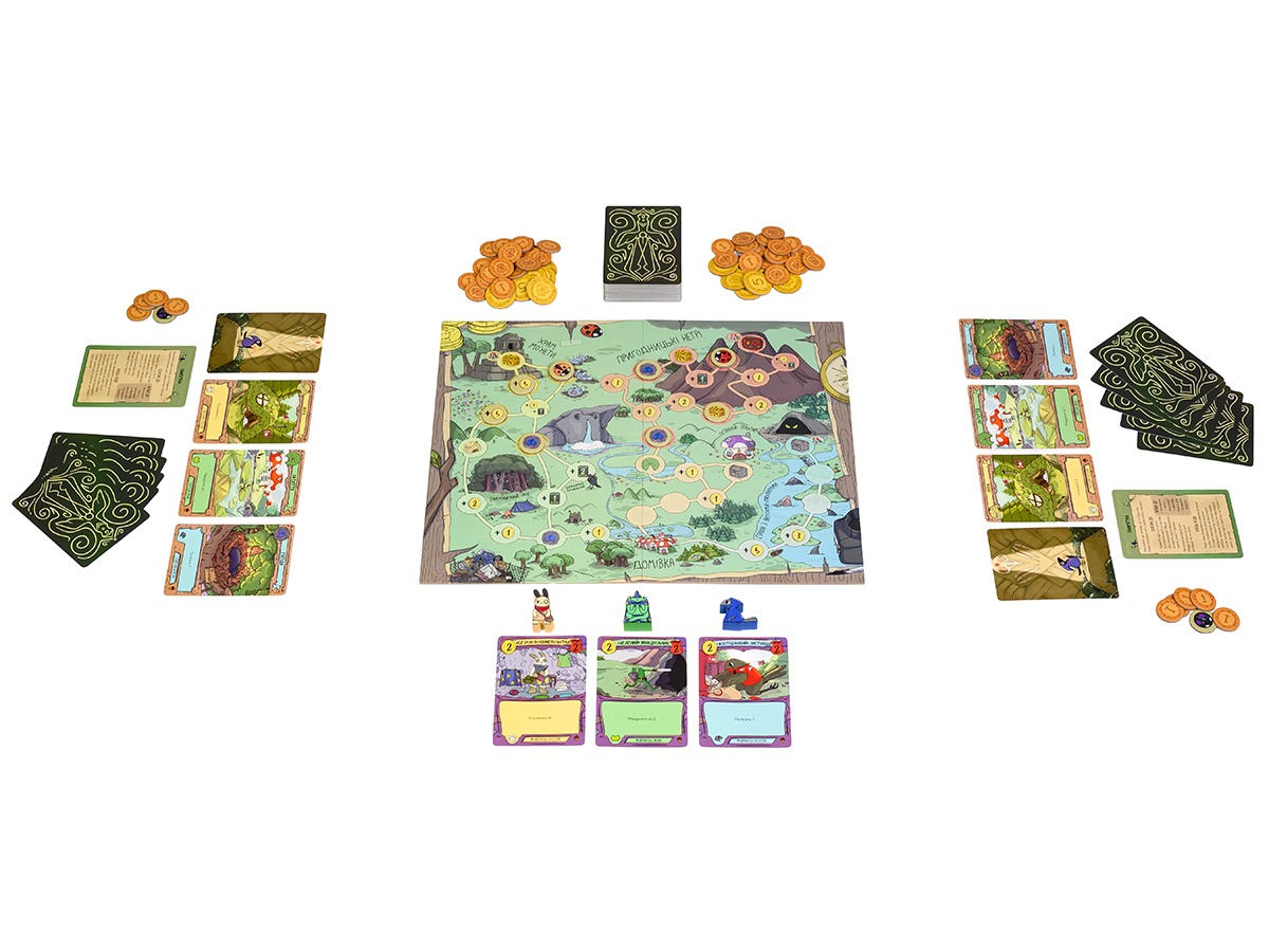Серце гри — побудова карткового рушія з трьох типів карт. Мешканці дають тобі дії: переміщатися стежками, тягнути нові карти, заробляти монети, набирати ресурси. Манатки — це унікальне спорядження, що підсилює твої можливості або дає бонуси в потрібний момент. Будівлі — основа економіки: вони забезпечують стабільний дохід ресурсів і відкривають нові стратегічні комбінації. Кожна картка має припаси — обмежену кількість активацій. Використав картку три-чотири рази — вона вичерпалася й автоматично стає переможними очками наприкінці гри. Це означає постійне жонглювання: хочеш активувати потужну дію зараз, але водночас не хочеш втрачати картку назавжди. Треба вчасно вводити в гру нових мешканців, щоб замінити тих, хто йде з твоєї колоди, і водночас не витрачати занадто багато ходів на набір карт замість руху до перемоги.