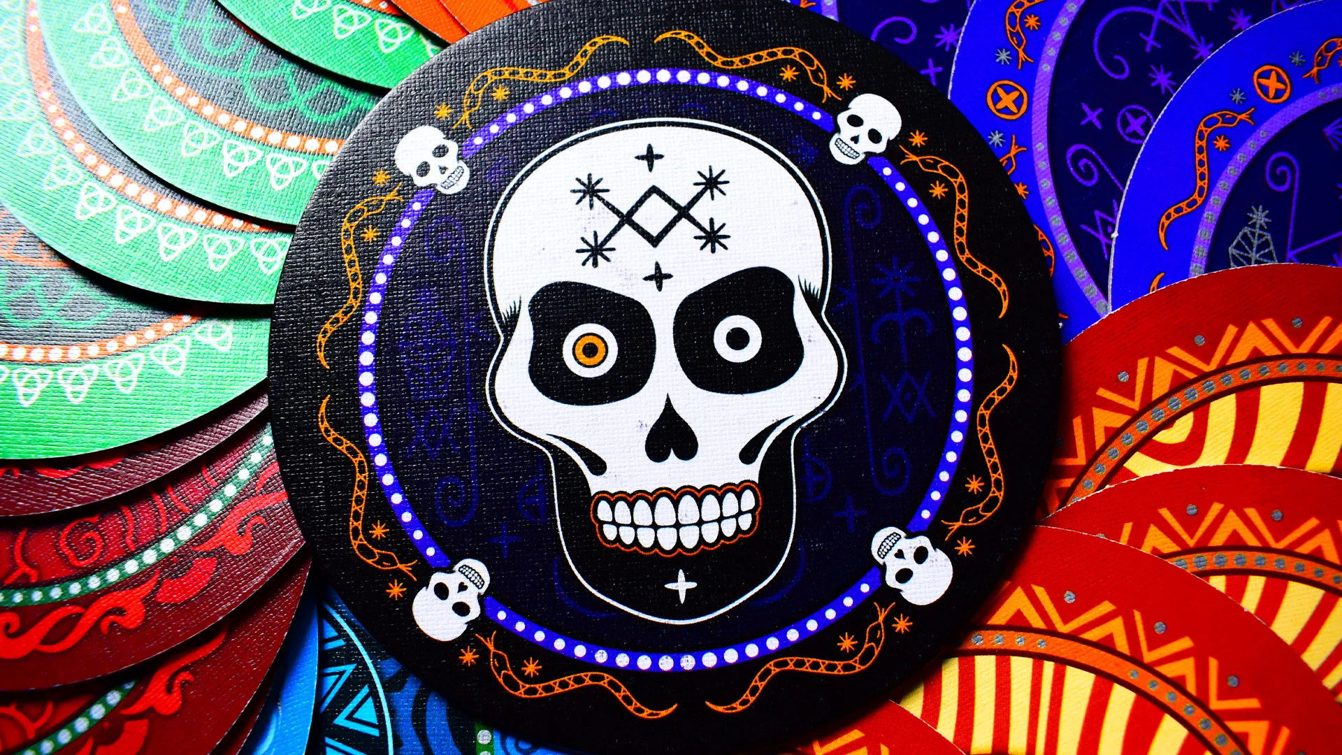У компактній коробці на тебе чекає 6 ігрових наборів, кожен у своєму унікальному кольорі з яскравими мексиканськими калаверами (стилізованими черепами). У кожному наборі: один планшет гравця, чотири круглі диски (три квітки + один череп) та один диск “останнього шансу”. Плюс книжка правил українською. Це все! Жодних зайвих компонентів – тільки те, що потрібно для блефу.