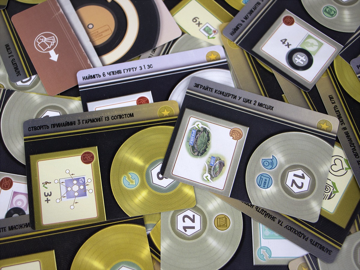 Картки «Розклад» дорівнюють запису, студійній репетиції або шоу у прямому ефірі. «Бонуси турне» дозволять подорожувати. А картки «Актив» допоможуть отримати обладнання, маркетингову підтримку, колаборації, фанатів. У фіналі раунду, коли в руці вже немає карт, гравці перевіряють виконання цілей: золотих, платинових або діамантових дисків (одноразові карти цілей).