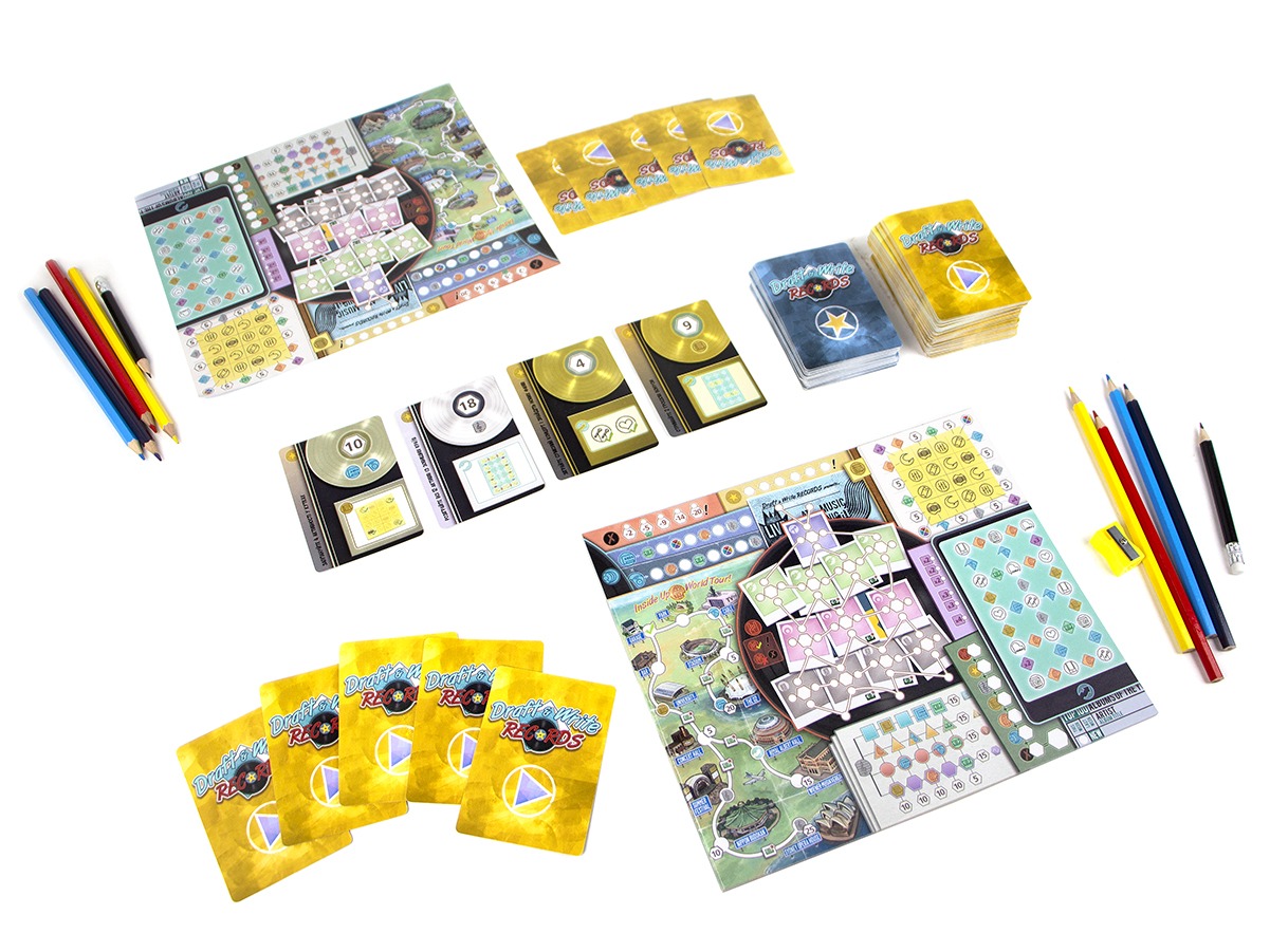 Карткова flip and write настілка «Draft & Write Records» пропонує гравцям зануритися у музичну тематику, створити власний гурт, розпоряджаючись активами та плануючи світове турне. Мета: здобути світове визнання та посісти перше місце в рейтингах. Щоб гурт був успішним, гравцям необхідно буде слідкувати за сумісністю всіх учасників та вправно міксувати здібності гурту, аби утворилася гармонія.