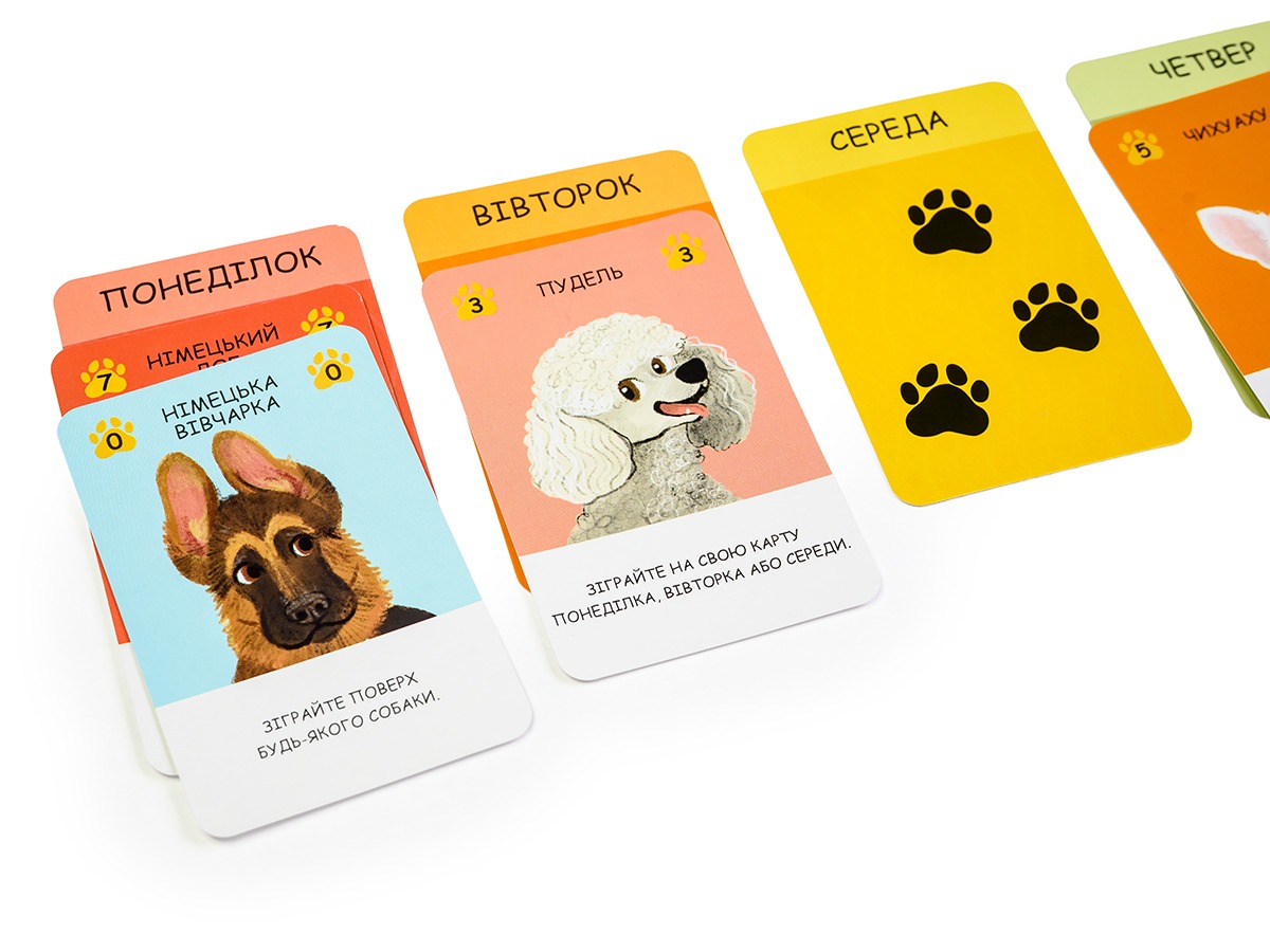 Правила розіграшу кожної карти описані прямо на ній – це дуже зручно! Деякі собаки вимагають розміщення у певні дні тижня, інші капризують щодо сусідів. Логіка тут залізна: чихуахуа точно не захоче опинитися між двома догами, а енергійний джек-рассел-тер’єр буде щасливий біля активних друзів. Більшість карт викладаються у вільний день, але є й такі песики, що вміють перекривати попередню картку. А ще – увага! – деякі карти можна зіграти у тиждень суперника або навіть поміняти з ним вже розіграних собак. Гра закінчується, коли хтось із гравців повністю заповнить свій тиждень. Підраховуйте бали на картах – хто набрав більше, той і переміг. У разі нічиєї виграє той, у кого більше зустрічей із песиками в розкладі.