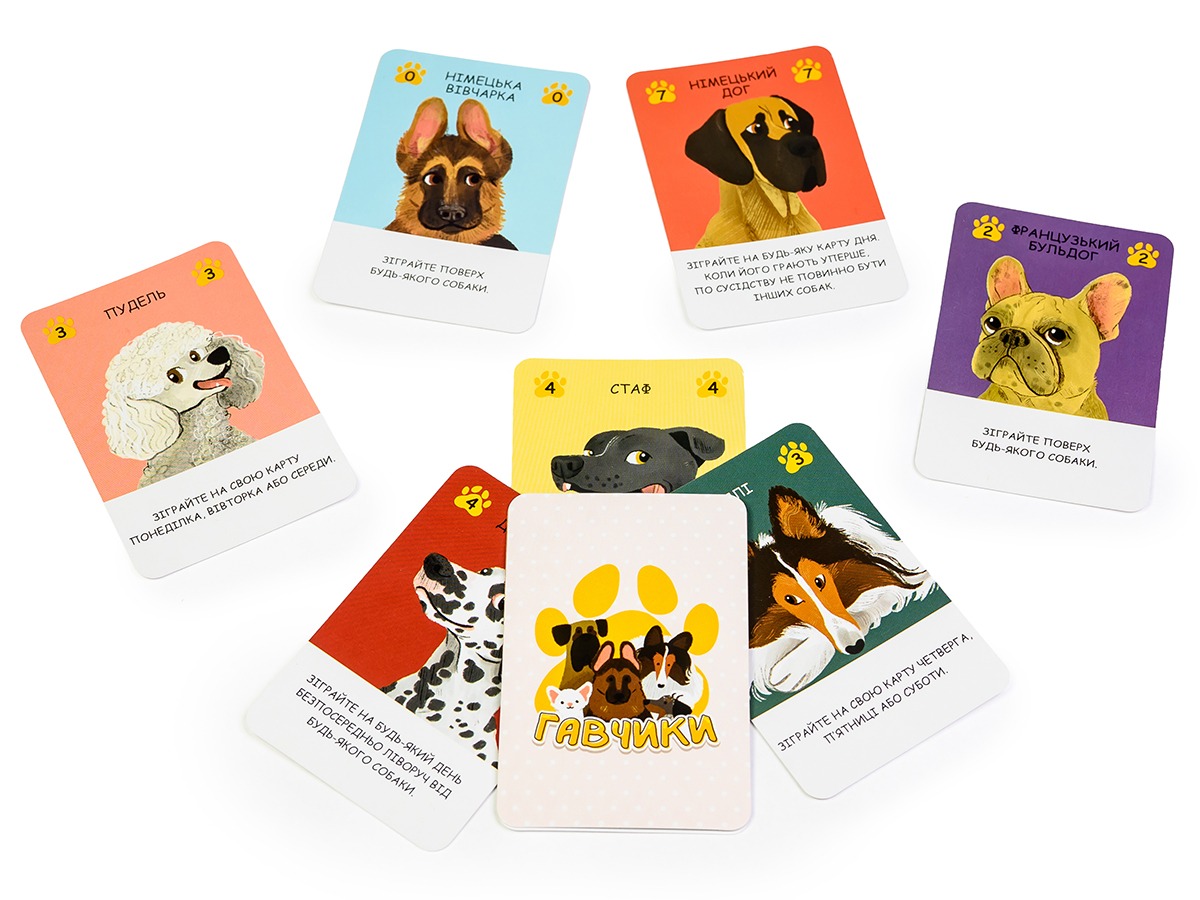 Уяви, що твій розклад на тиждень складається виключно зі зустрічей із різними песиками! Лабрадор у понеділок, коргі в середу, мопс у п’ятницю… Хіба це не мрія? “Гавчики” – мила карткова гра для двох, де ти заповнюєш свій тижневий календар зустрічами з різноманітними породами собак. Кожен пухнастик має свій характер: хтось любить компанію великих собак, хтось навпаки – соромиться і воліє сидіти сам. Твоє завдання – зібрати найвеселіший і найбільш виграшний собачий розпорядок за сім днів. Ця гра розтопить серце будь-якого собачника!