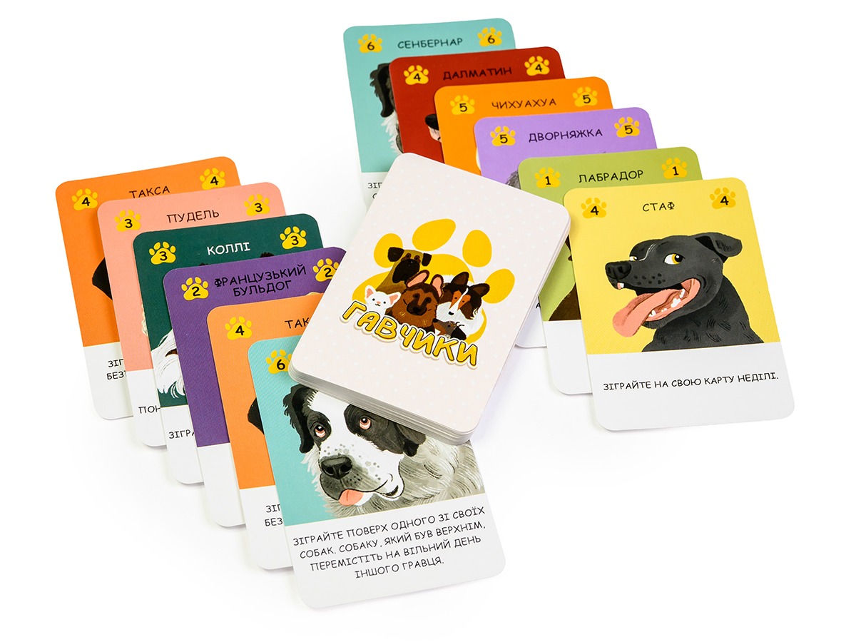 Одна коробка “Гавчиків” розрахована на дуель – гру для двох гравців віком від 6 років. Але ось магія: якщо додати ще одну коробку, можна грати вчотирьох! А якщо взяти ще й “Нявчиків” (котячу версію гри), то виходить справжній батл собак проти котів. Партія триває всього 5-15 хвилин – це ідеальна тривалість для легкої гри перед сном або між справами. У коробці знайдеш карти з різними породами собак, кожна з яскравими ілюстраціями та чіткими правилами на картці. Компактний розмір дозволяє брати гру з собою куди завгодно – у гості, на пікнік, у відпустку.