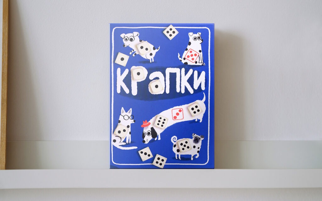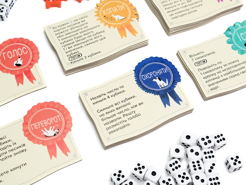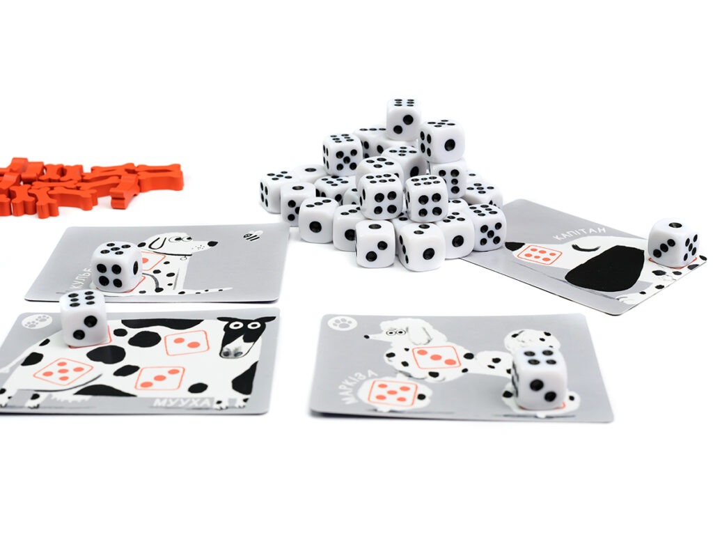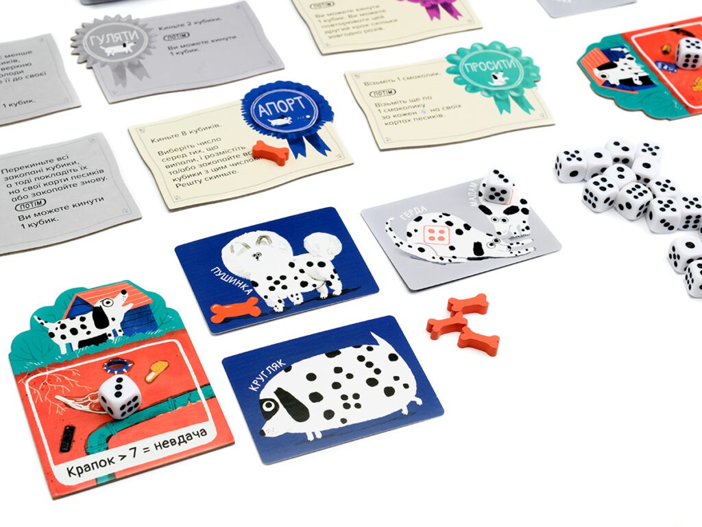 У настільній грі “Крапки” ти кидаєш кубики, щоб заповнити карти собак цяточками (у вигляді крапок, що випадають на кубиках), і прагнеш завершити 6 карти раніше за інших гравців.