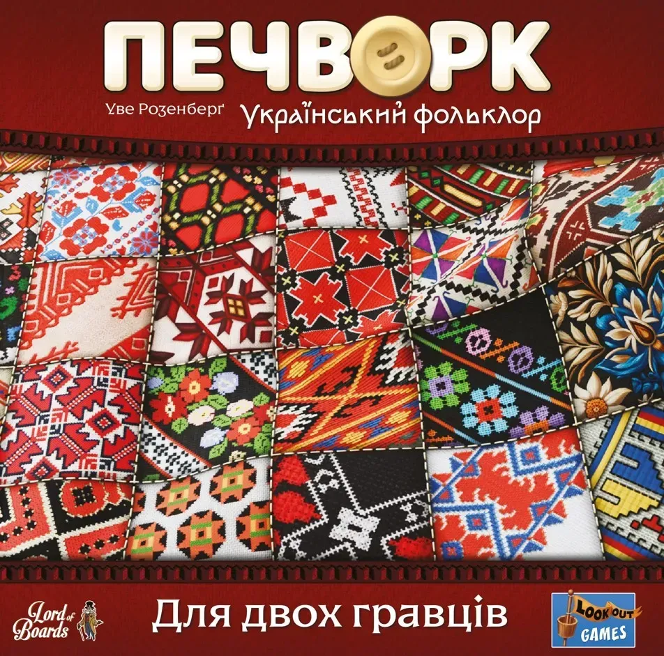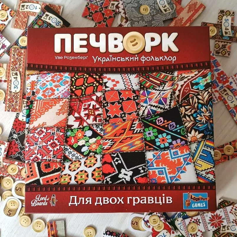 Уяви собі спокійний вечір у бабусиній хаті, де за столом лежать клаптики яскравих тканин з традиційними українськими орнаментами. Так от, Печворк. Український фольклор (Patchwork) – це саме та гра, де ти стаєш майстром старовинного ремесла, але замість голки й нитки отримуєш картонні плитки та ґудзики. Це особливе видання класичної дуельної гри від легендарного Уве Розенберга, повністю перероблене талановитим українським дизайнером Максимом Гнатиком у дусі нашого фольклору.
