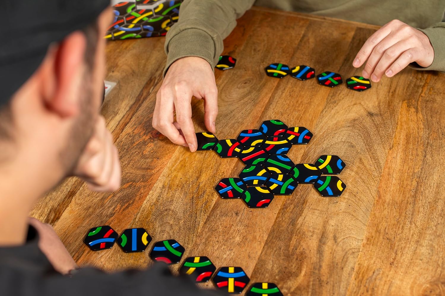 Уяви: 56 чорних шестикутних плиток, на кожній — три кольорові лінії (червона, синя, жовта або зелена). Твоє завдання — викладати плитки так, щоб кольори на краях стикувалися. Червоне до червоного, синє до синього. Просто? Тільки на перший погляд. Бо коли починаєш будувати свою лінію, виявляється, що кожна плитка може стати і твоїм порятунком, і твоєю пасткою.