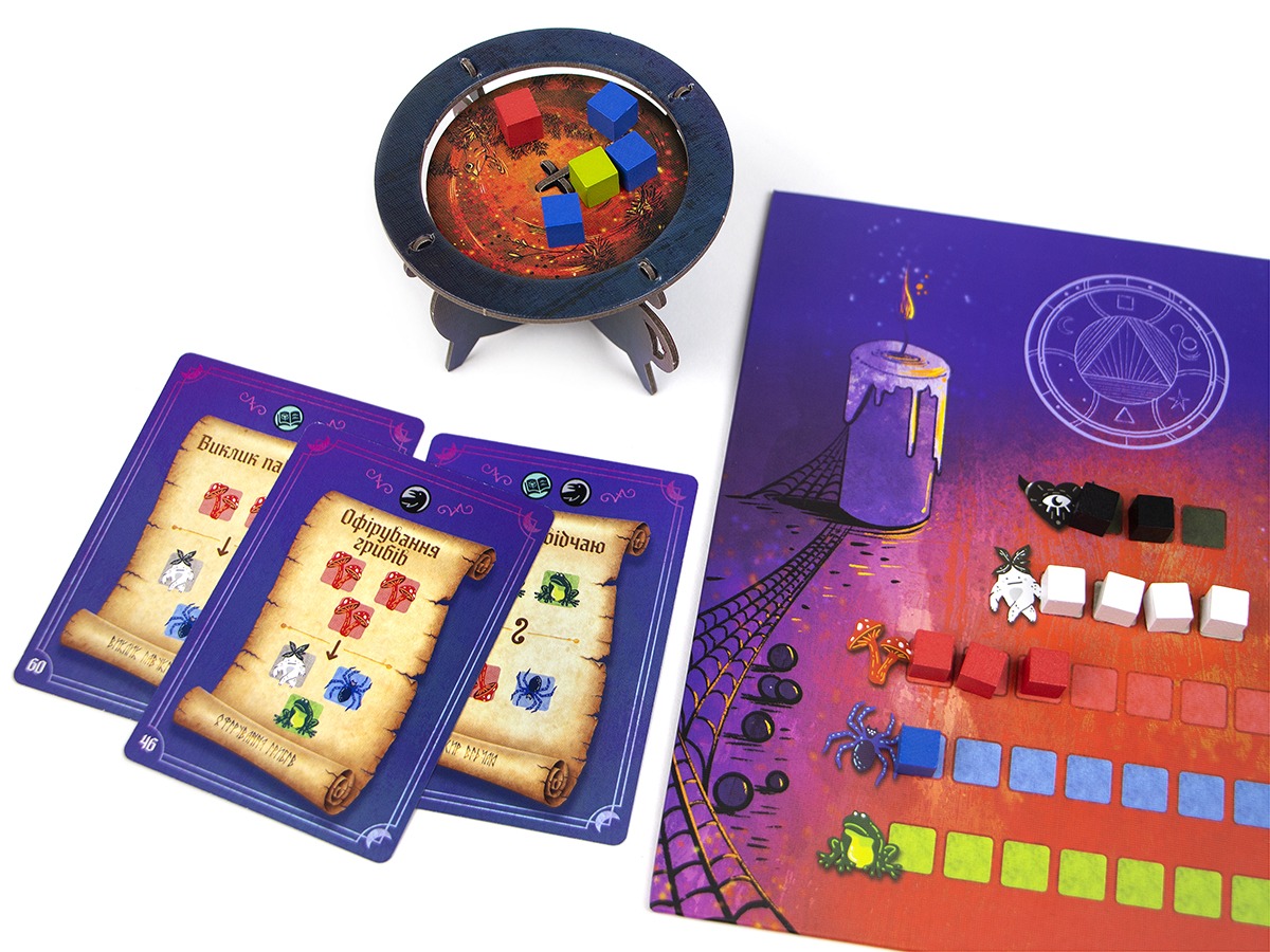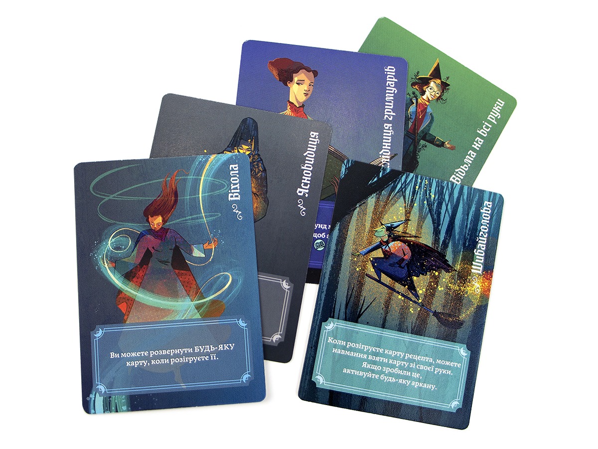 Звісно, бо під час гри у «Відьомську Круговерть» може статися всяке. А підкинути у казан суперника зайвий складник – святе! Настілка починається однаково для кожного гравця: усі отримують на руки 4 картки рецептів, а також певну кількість інгредієнтів, що розміщуватимуться на панчборді (себто, у казанку).