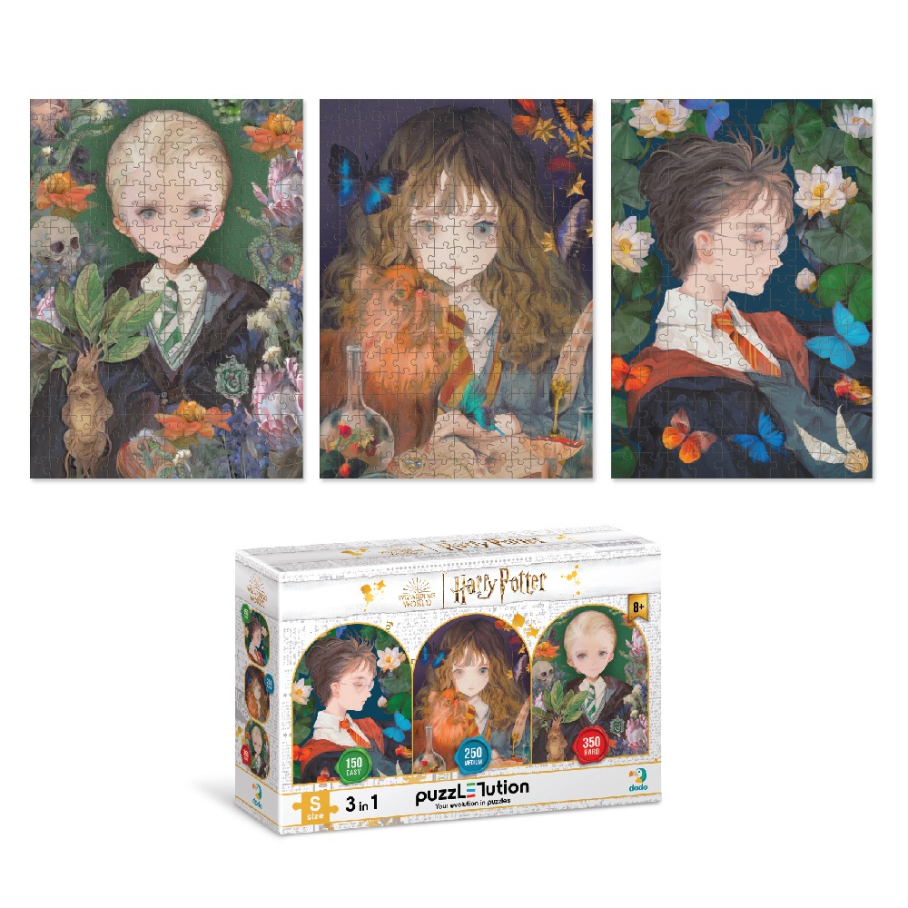 Пазл 3 в 1 Dodo “Harry Potter. Мрія і фантазія” — це унікальний набір від українського бренду DoDo, у якому три окремі пазли з трьома різними зображеннями сховані в одній коробці. Кожна ілюстрація виконана у сучасному художньому стилі аніме — Гаррі Поттер, Герміона Грейнджер та Драко Мелфой зображені на тлі квітів, метеликів та атмосфери чарівного світу Гоґвортсу. Ці образи несхожі на класичні кінопортрети — вони свіжі, мрійливі та по-справжньому красиві.