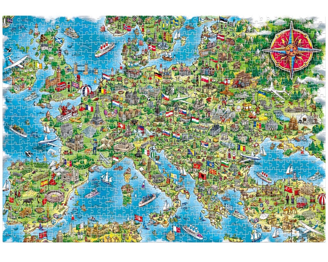 1000 деталей на 67×47 см. Пазл-віммельбух — формат, де кожен сантиметр наповнений життям. Люди в національних вбраннях танцюють, працюють, подорожують. Кожна країна має прапор і столицю. Візуальні елементи показують її особливість: Великобританія — червоні автобуси та Біг-Бен, Греція — античні храми, Нідерланди — вітряки та тюльпани.