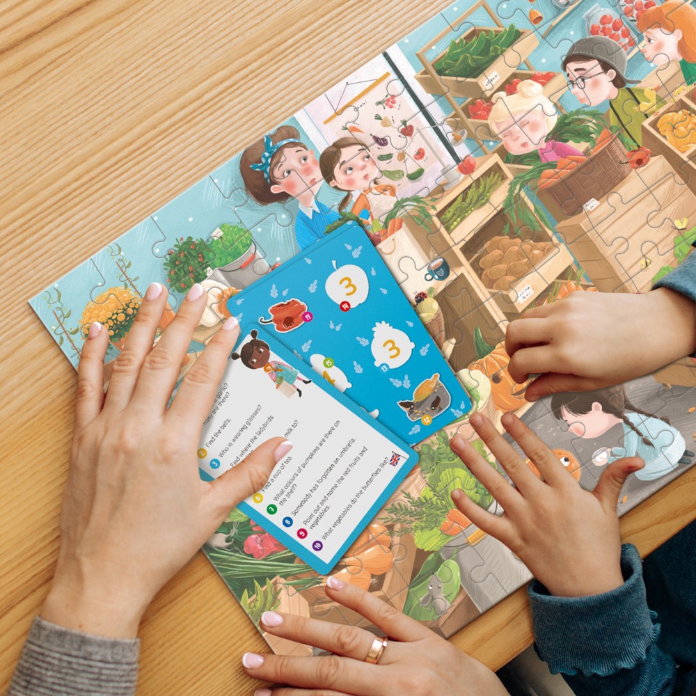 Після того, як малюк зібрав яскравий пазл з осінньою картиною, починається найцікавіше. Тепер треба шукати заховані об’єкти за підказками на спеціальних картках — овочі, фрукти, гриби, листочки та інші осінні дари природи ховаються серед деталей ілюстрації. Це перетворює пазл у багаторазову гру, до якої хочеться повертатися знову і знову!