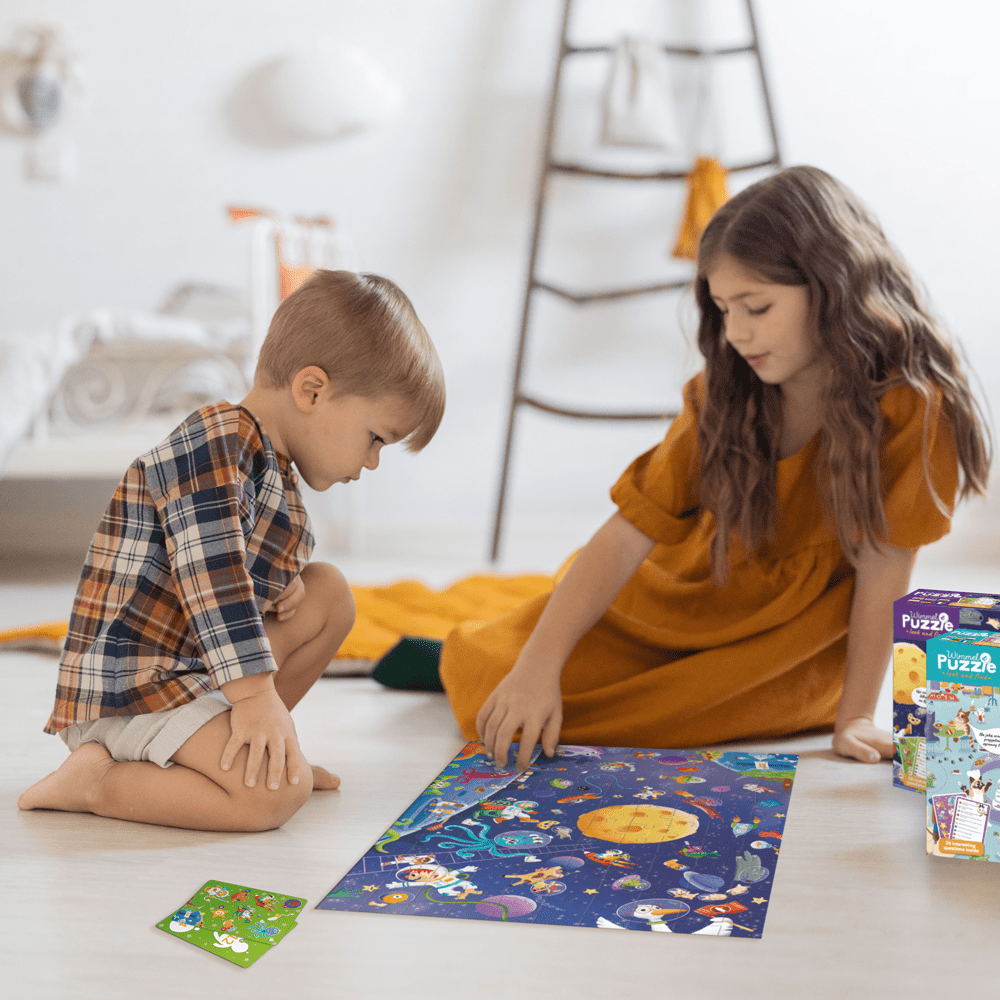 Після того, як дитина зібрала яскравий пазл з космічним пейзажем, починається справжня космічна місія. Треба шукати заховані об’єкти за підказками на спеціальних картках — астронавтів, інопланетян, космічні апарати та інші дивовижні предмети. Це тренує зорову пам’ять, дрібну моторику та навички спостереження, а також розвиває уяву та логічне мислення.