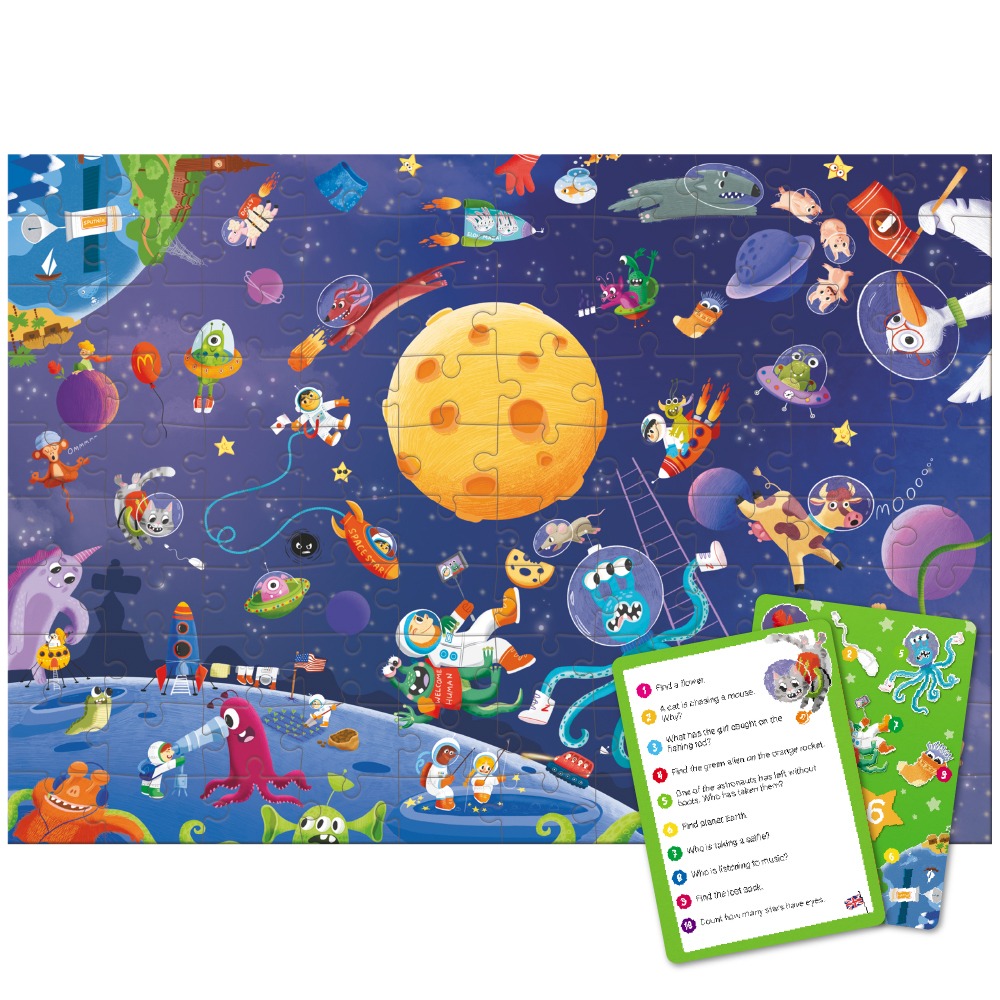 У комплекті йдуть 2 двосторонні картки із завданнями на 4 мовах: українська, англійська, польська та німецька. Дитина шукає на зібраному пазлі 20 об’єктів, тренуючи концентрацію та уважність. Грати можна як самостійно, так і влаштовуючи змагання — хто швидше знайде всі космічні скарби?