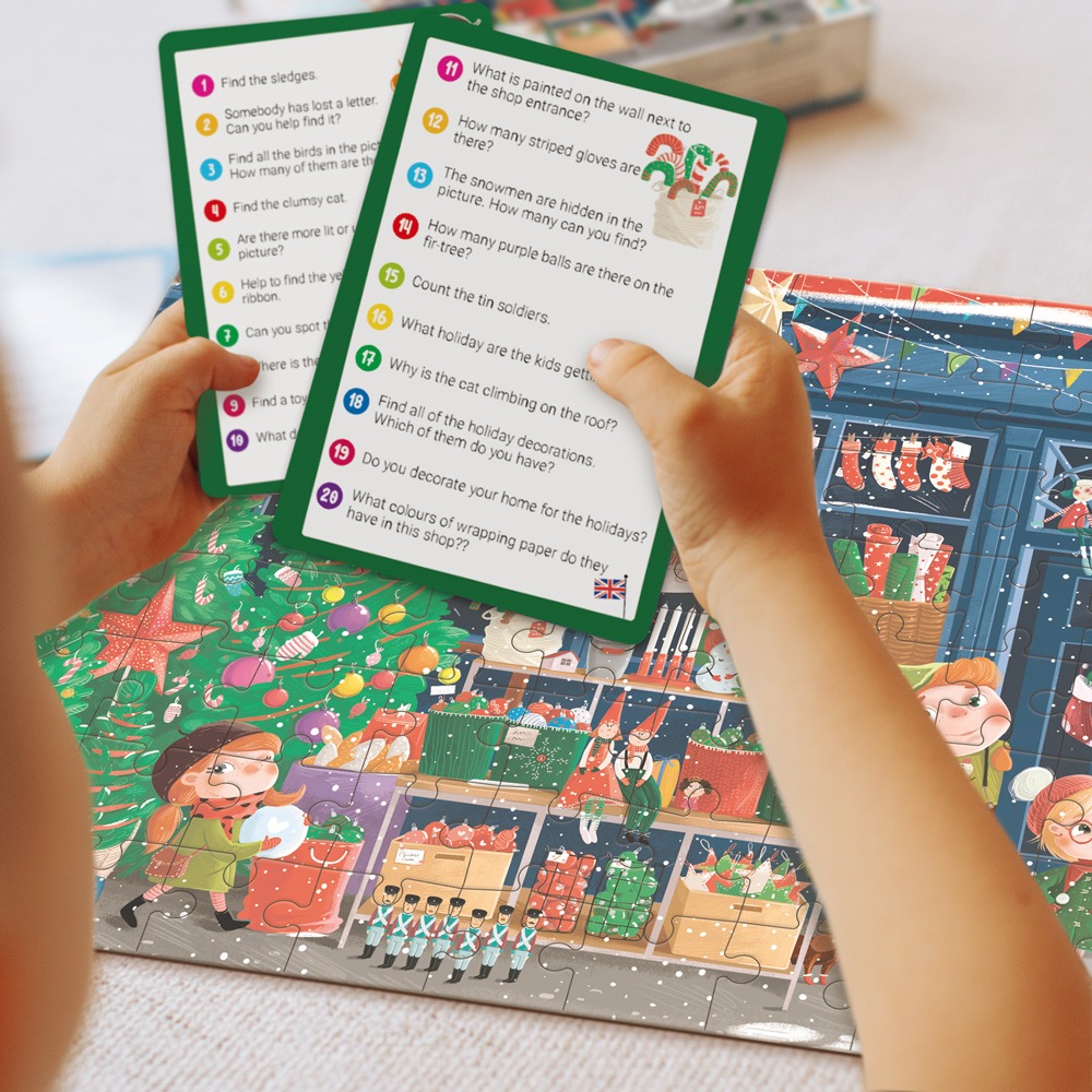 Після того як пазл зібрано, гра тільки починається! У комплекті йдуть 2 двосторонні картки із завданнями на 4 мовах (українська, англійська, польська, болгарська) – загалом 20 інтерактивних завдань! “Знайди червоний шарф”, “Порахуй скільки сніговиків”, “Де ховається сніжинка з посмішкою?” – кожне завдання перетворює складання пазла на справжню гру на уважність та спостережливість!