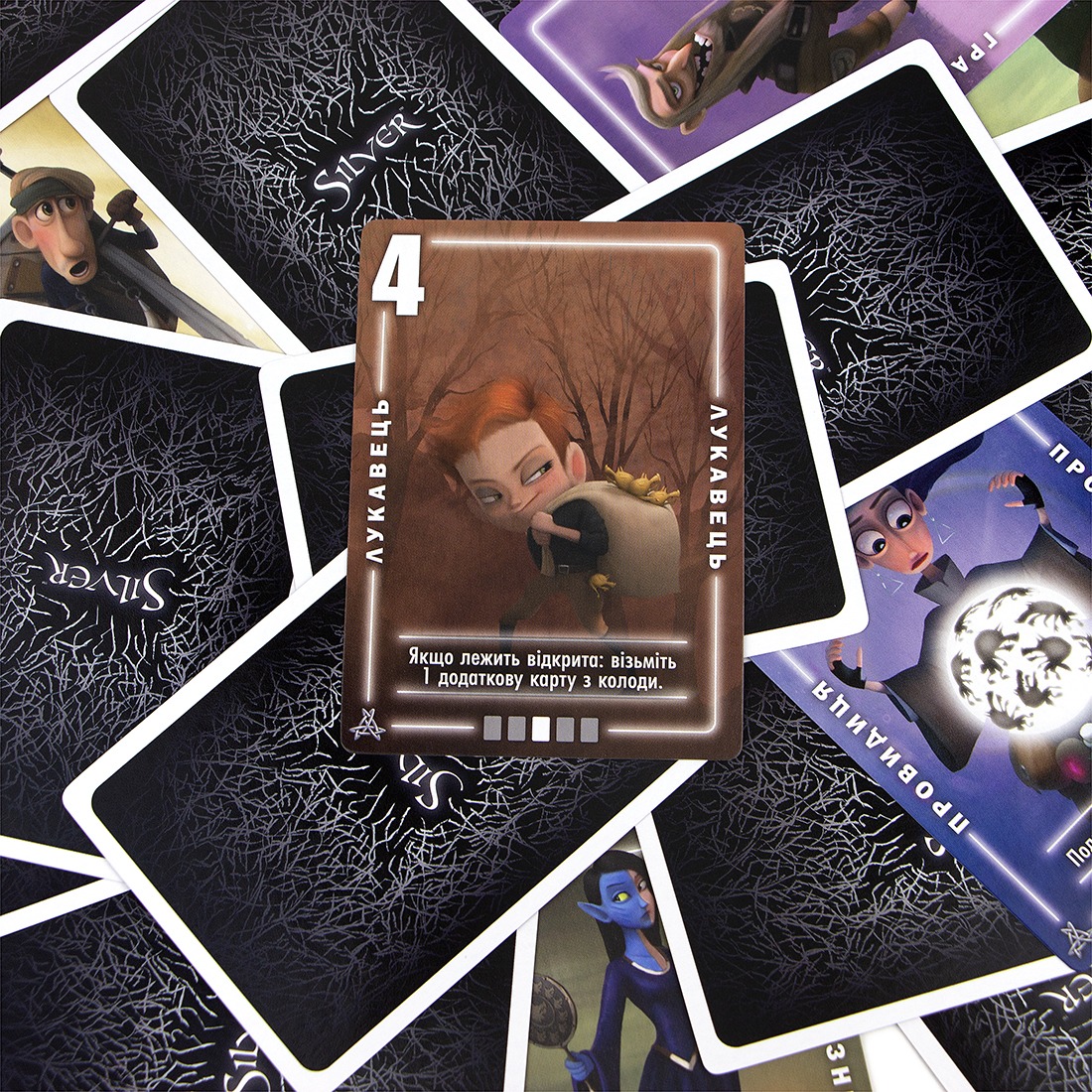 Місяць сходить над селом, а разом із ним — неспокій. Вовкулаки змішалися з мирними жителями, і тепер кожен може виявитися загрозою. “Silver” — це карткова баталія на пам’ять, хитрість та холодний розрахунок для двох-чотирьох гравців віком від чотирнадцяти років, де партія триває близько тридцяти-шістдесяти хвилин. Твоя мета — очистити власне поселення від перевертнів за чотири раунди, поки інші роблять те саме. Кожна карта в руці — це житель з особливою вміннями, але водночас і кількість вовків, яких він притягує. Парадокс: найпотужніші персонажі коштують найдорожче у штрафних балах.